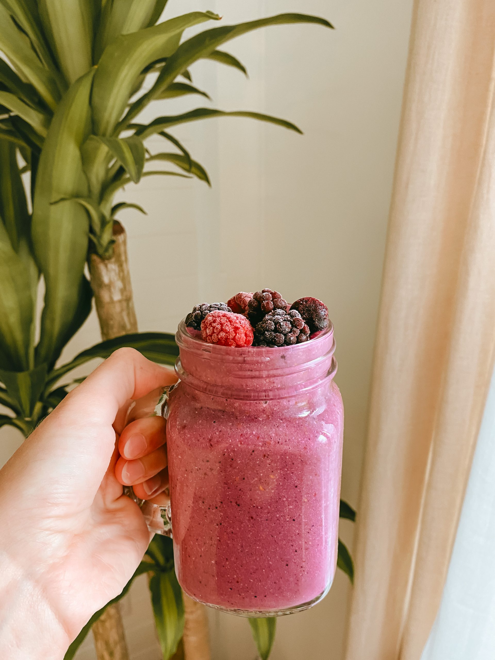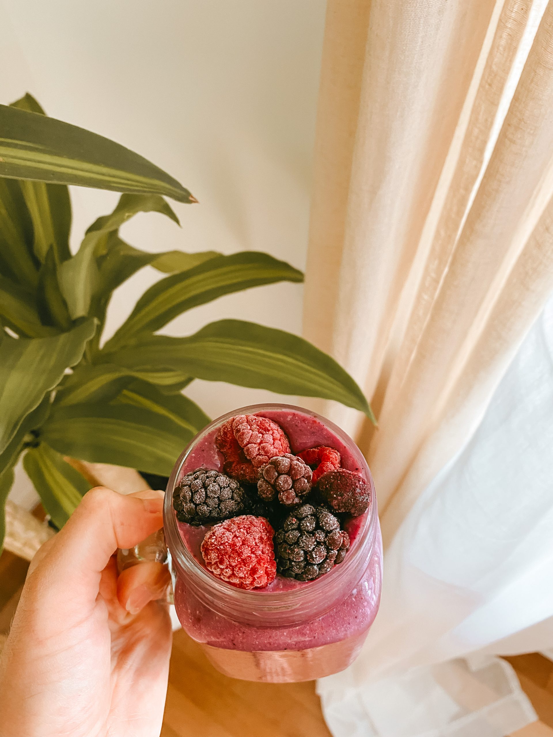 J’ai l’impression que ça fait 1000 ans que je n’avais pas sorti une recette de smoothie ! Avant, j’en buvais littéralement TOUS les jours, puis j’ai fini par perdre l’habitude. Avec l’été et les grosses chaleurs, ça me donne envie d’en refaire ! Cette recette contient principalement des petits fruits (comme des fraises, framboises, bleuets et mûres) qu’on retrouve présentement dans nos champs à ce temps-ci de l’année. Je ne sais pas si tu aimes aller cueillir tes propres fruits (une très belle activité à faire en famille), mais pour ma part, je préfère les acheter directement au marché (c’est un peu moins mon genre d’activité d’avoir chaud accroupie dans un champs… haha) ! Bref, que tu les achètes au marché ou que tu les cueilles toi-même, cette recette est une belle façon de les consommer.