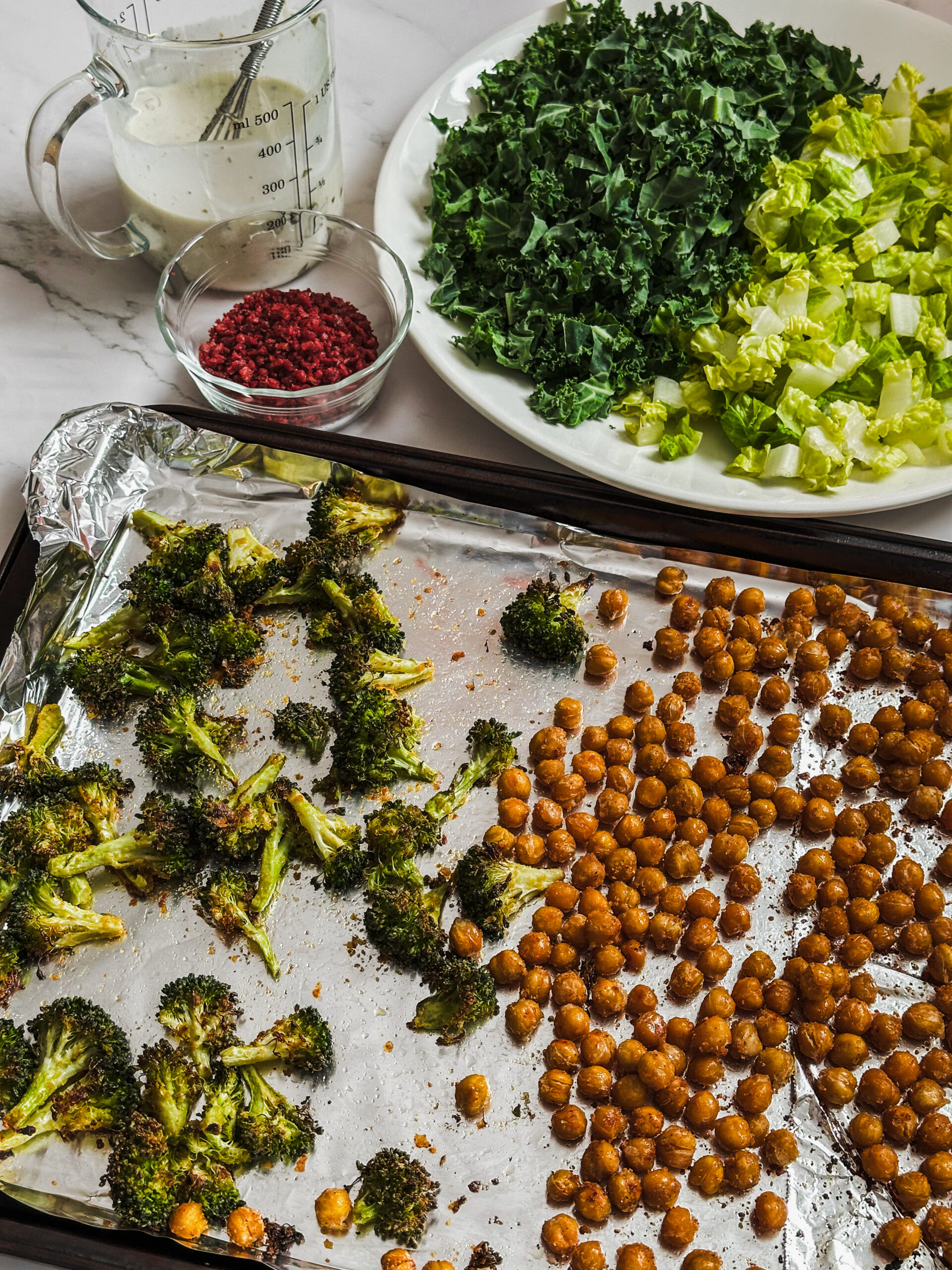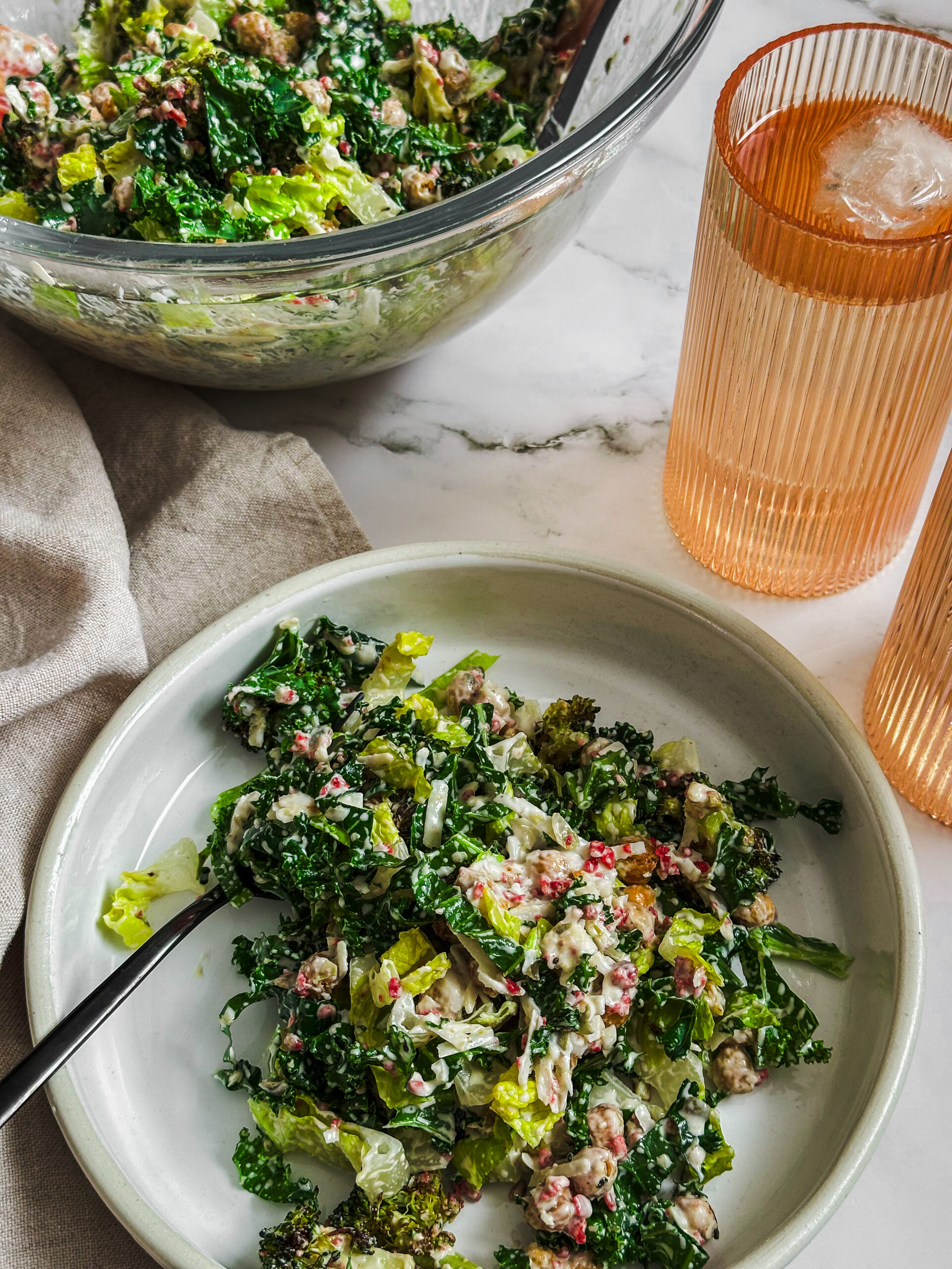 Cette salade est un gros « hit » ici. Chaque fois que je fais une salade César, mon mari me demande si j’ai noté la recette parce qu’il disait que je me DEVAIS de la partager. J’oubliais toujours hihi, mais PAS aujourd’hui ! Alors voilà, je vous offre ma délicieuse recette de salade César version très améliorée avec du chou frisé, des pois chiches et des brocolis. Bon appétit !