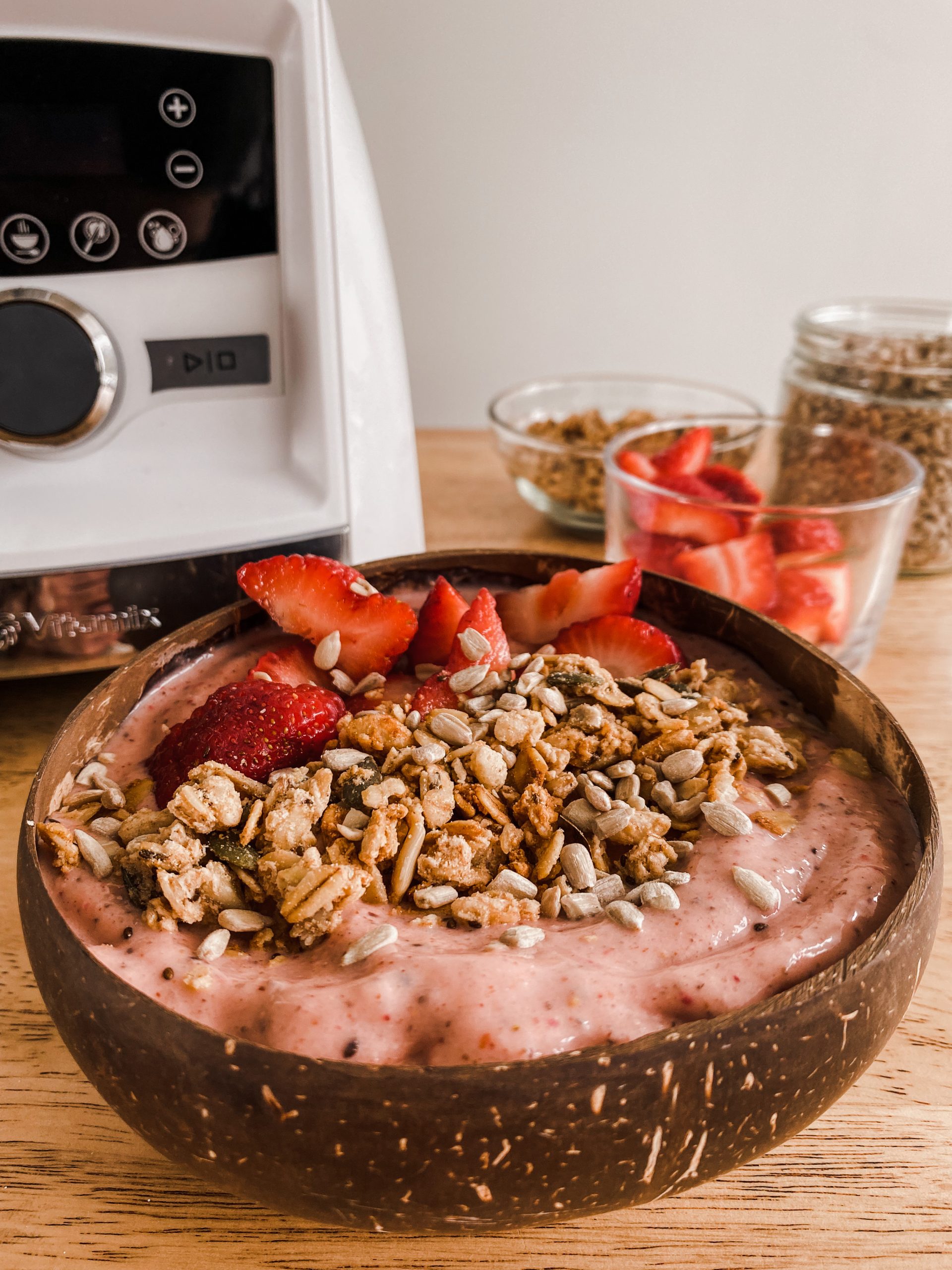 Le Vitamix Ascent A3500 me permet de cuisiner plusieurs recettes comme de délicieux bol de smoothie (voir recette ci-bas), des trempettes et tartinades, des soupes et potages, des sauces et des smoothies. Je pense sincèrement que le Vitamix Ascent A3500 permet de sauver du temps, apporte une tranquillité d’esprit quant à la qualité de nos recettes et permet de savourer des textures onctueuses et sublimes !
