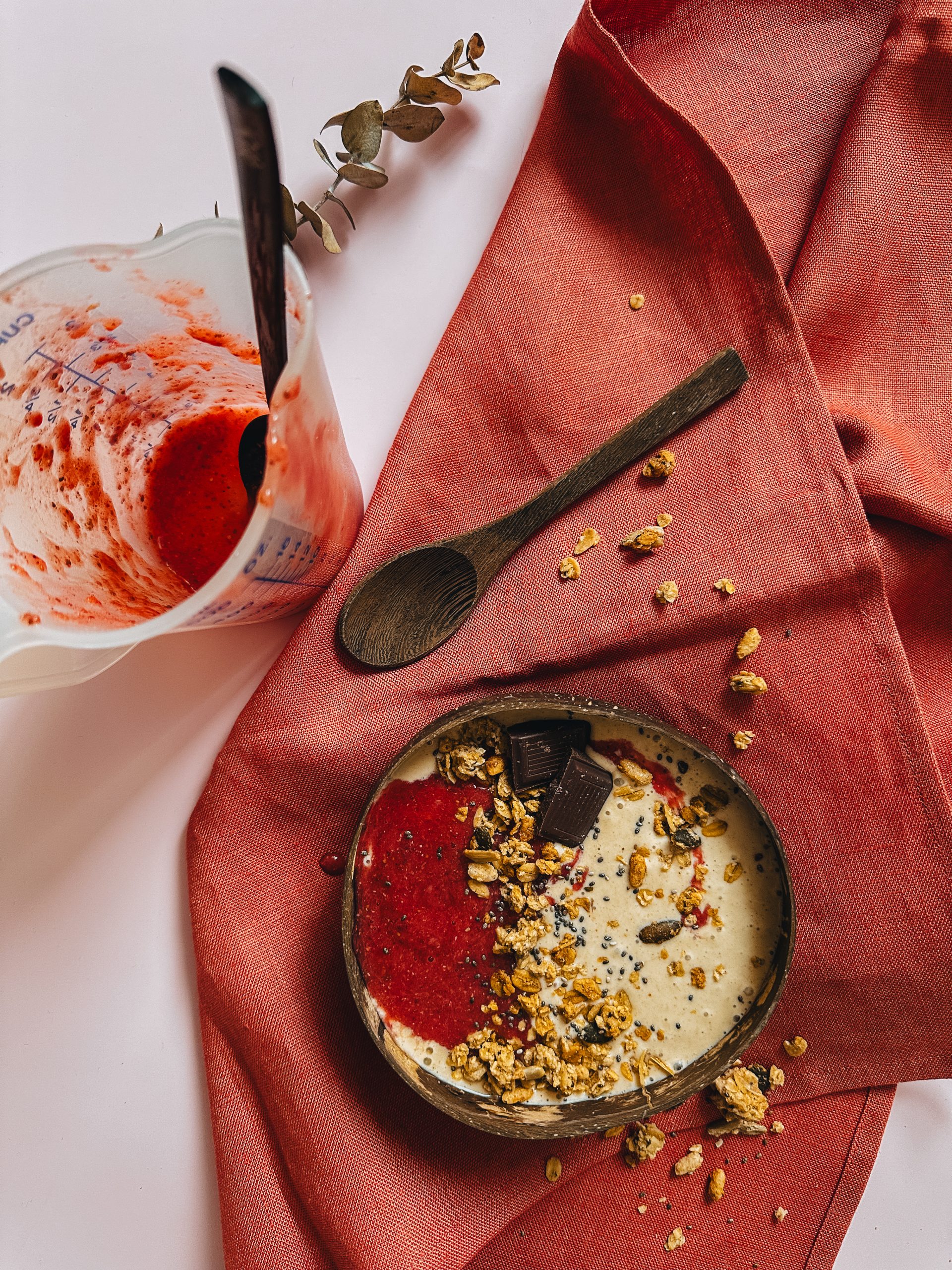 Enfin une recette de déjeuner ! Ça faisait longtemps il me semble… Je suis super heureuse de vous présenter cette nouveauté qui est absolument décadente. Les photos crient PRINTEMPS et j’adore ça (je suis déjà bien tannée de l’hiver). J’espère que cette recette rendra vos matinées plus agréable par son goût absolument divin et rafraîchissant !