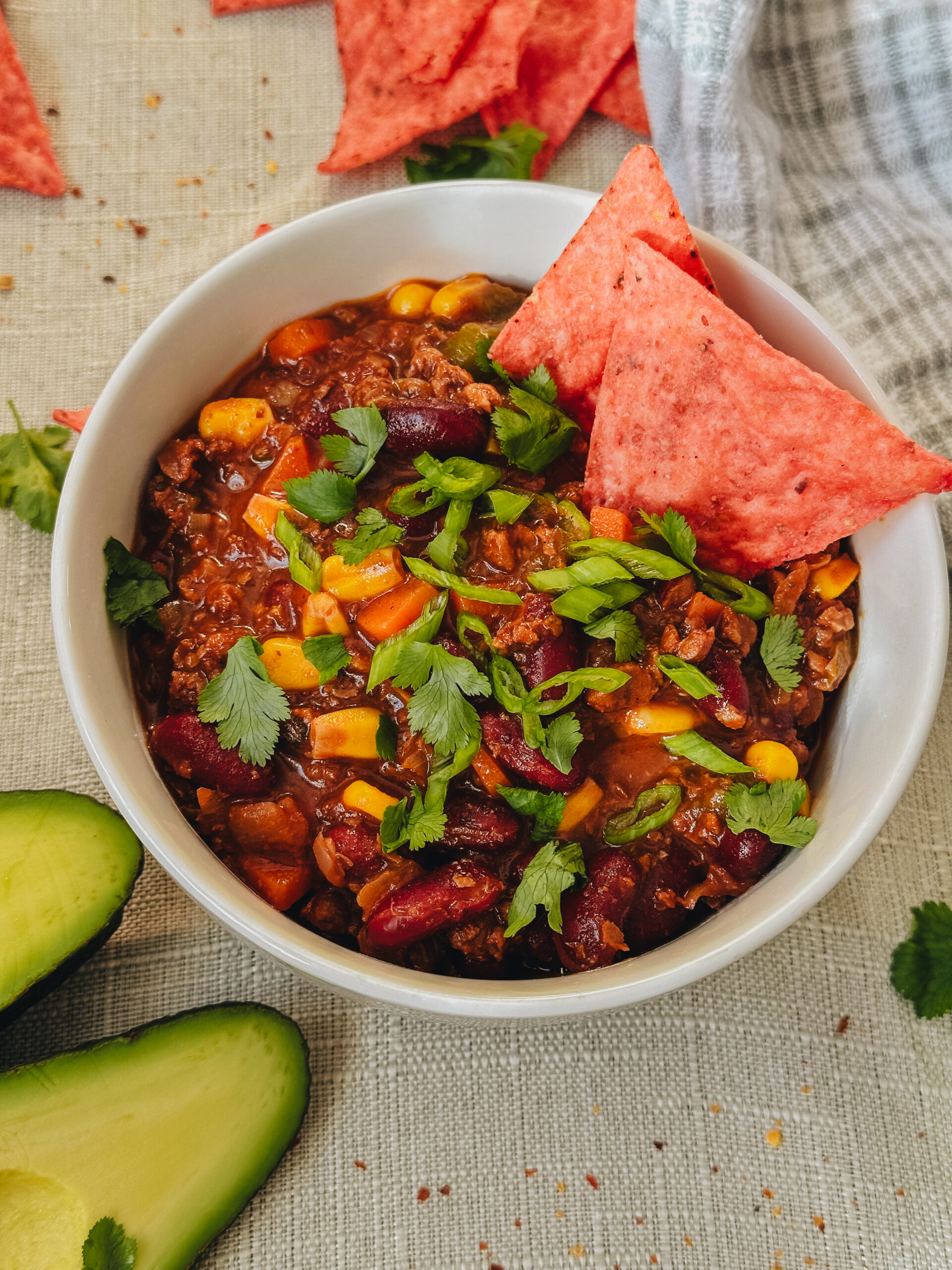 J’ai longtemps pensé que je n’aimais pas le chili, jusqu’à ce que je crée ma propre recette. J’ai souvent trouvé ça trop acide et mon petit estomac fragile ne l’appréciait pas. J’ai créé une version tout aussi goûteuse d’un chili traditionnel, mais sans le goût acide. Sa douceur va vous charmer à tout coup j’en suis convaincue !