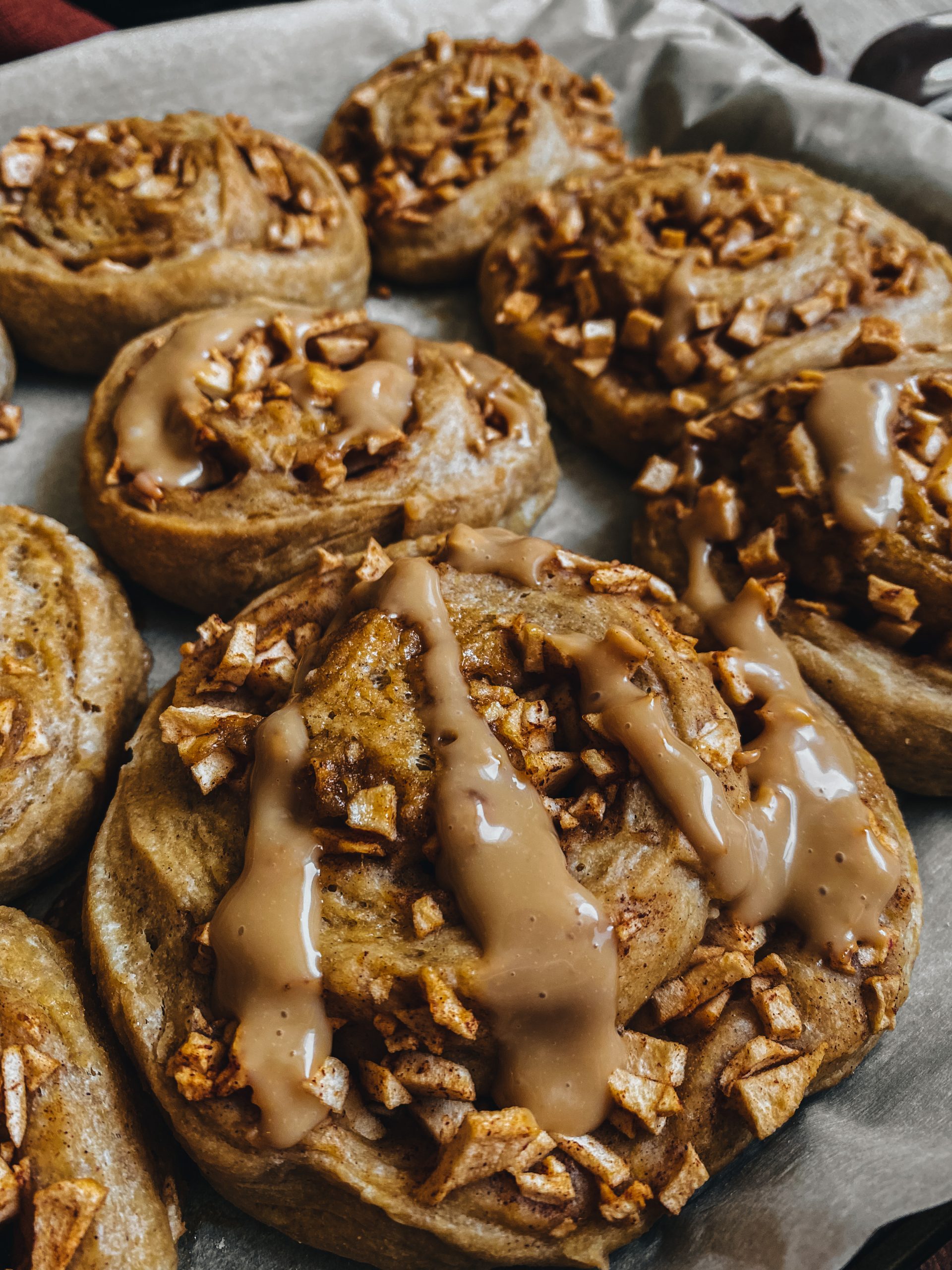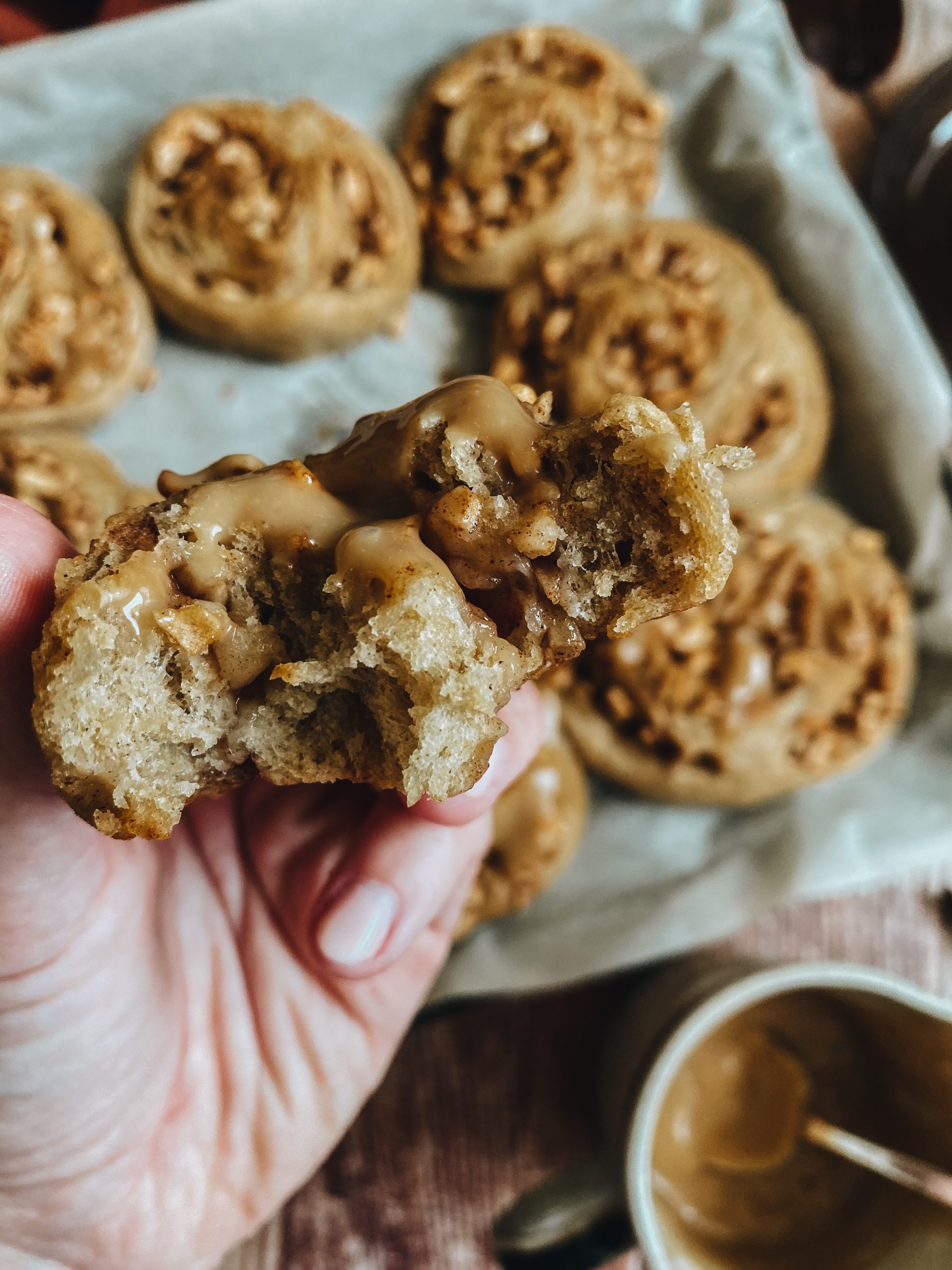 Vous verrez que l’option d’ajouter du caramel végane en garniture est optionnelle. Celui-ci ajoute un petit quelque chose, mais il n’est pas nécessaire. J’ai travaillé fort pour que ces brioches soit très moelleuses et elles sont donc parfaites telle quelle ! À savoureux avec un délicieux café ou n’importe quelle boisson chaude que vous aimez boire pendant les temps plus frais.
