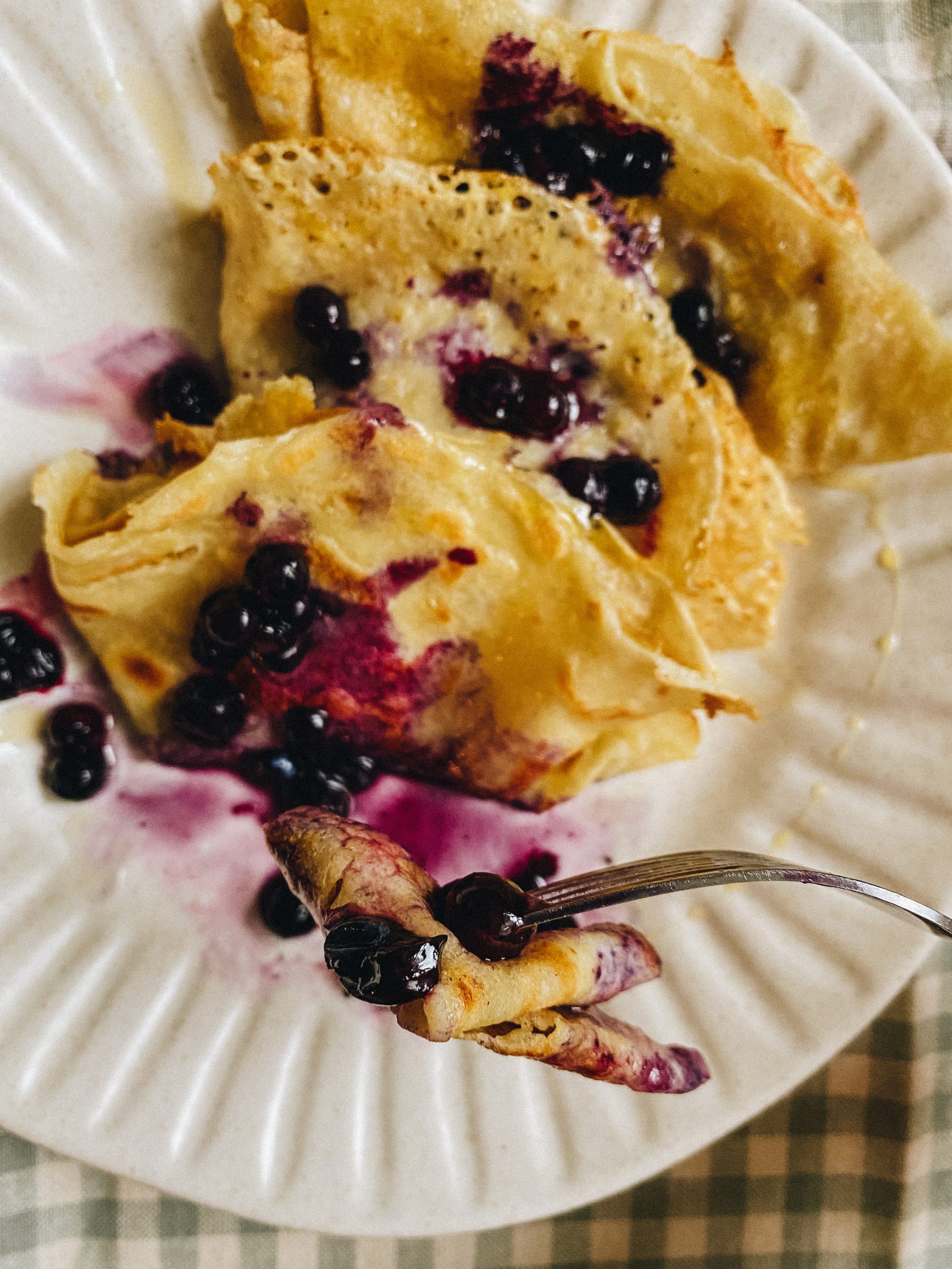 Ça faisait longtemps que j’avais envie de créer une recette de crêpes classiques ! Je trouve que c’est un déjeuner tellement délicieux et très personnalisable selon nos envies. Personnellement, ma combinaison préférée c’est soit du sirop d’érable avec bleuets (comme sur la photo) ou avec une tartinade de chocolat (celles véganes de Allo Simonne sont super bonnes). Pour plus d’option de crêpes (sans gluten) ou pancakes, c’est par ici !