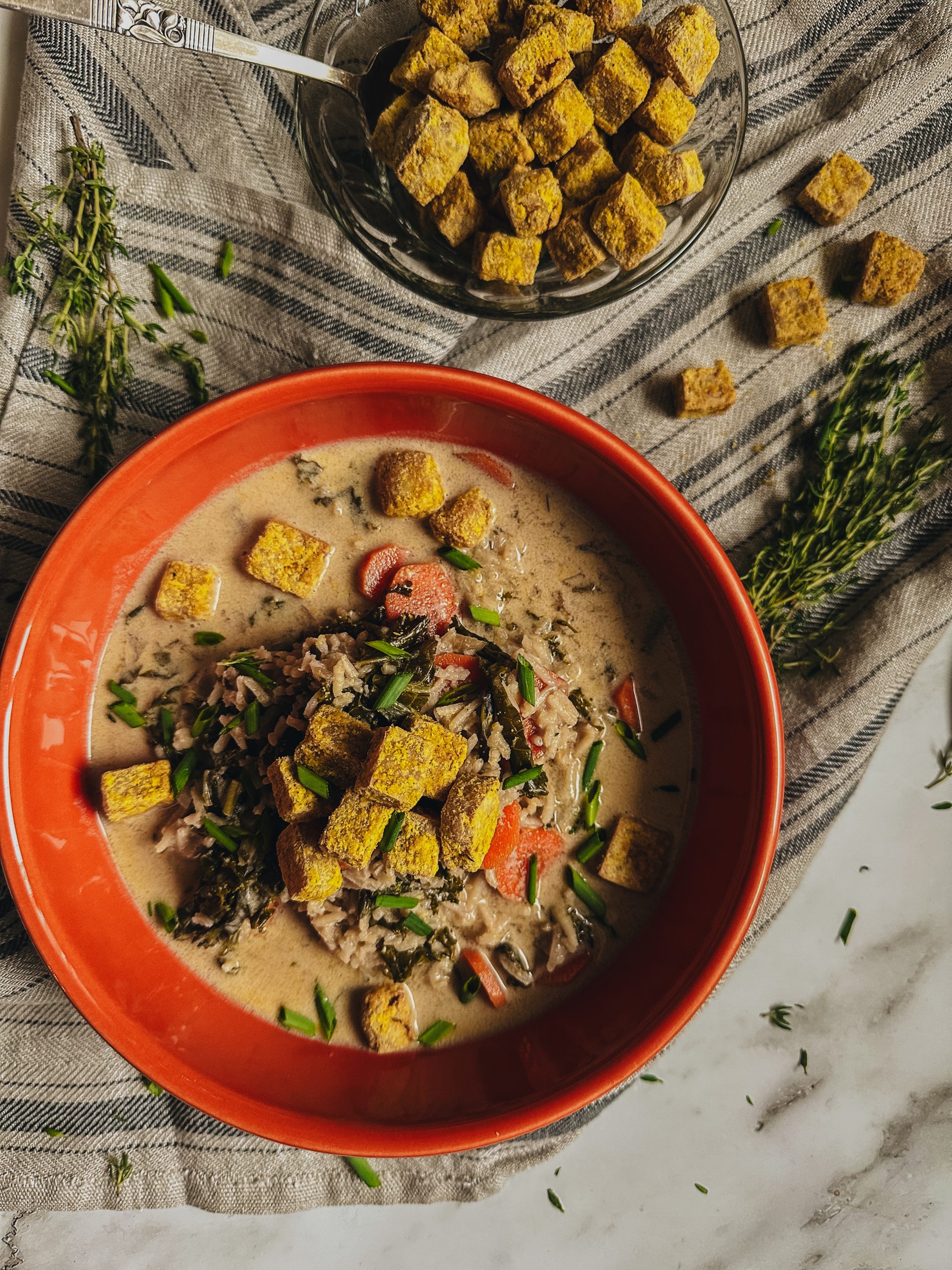 4. Ajouter le riz à la soupe, mélanger et servir avec les croûtons de tofu.