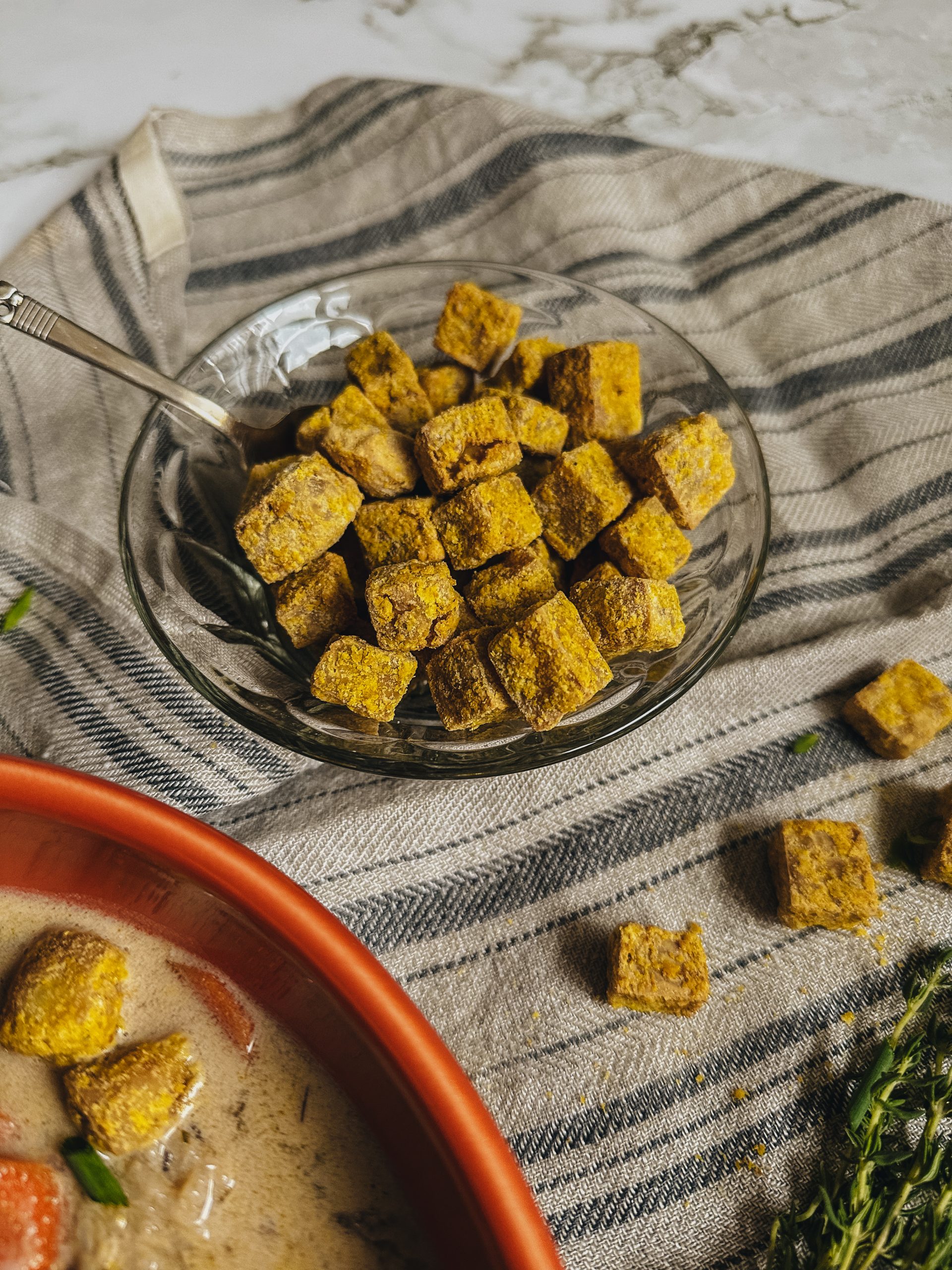 Je recommande fortement de faire ma recette de croûtons de tofu. Ces croûtons peuvent littéralement être consommés comme des chips tellement ils sont bons ! Sinon, pourquoi ne pas les ajouter à vos potages préférés ou encore vos salades favorites. C’est une excellente façon d’ajouter des protéines végétales à vos repas.