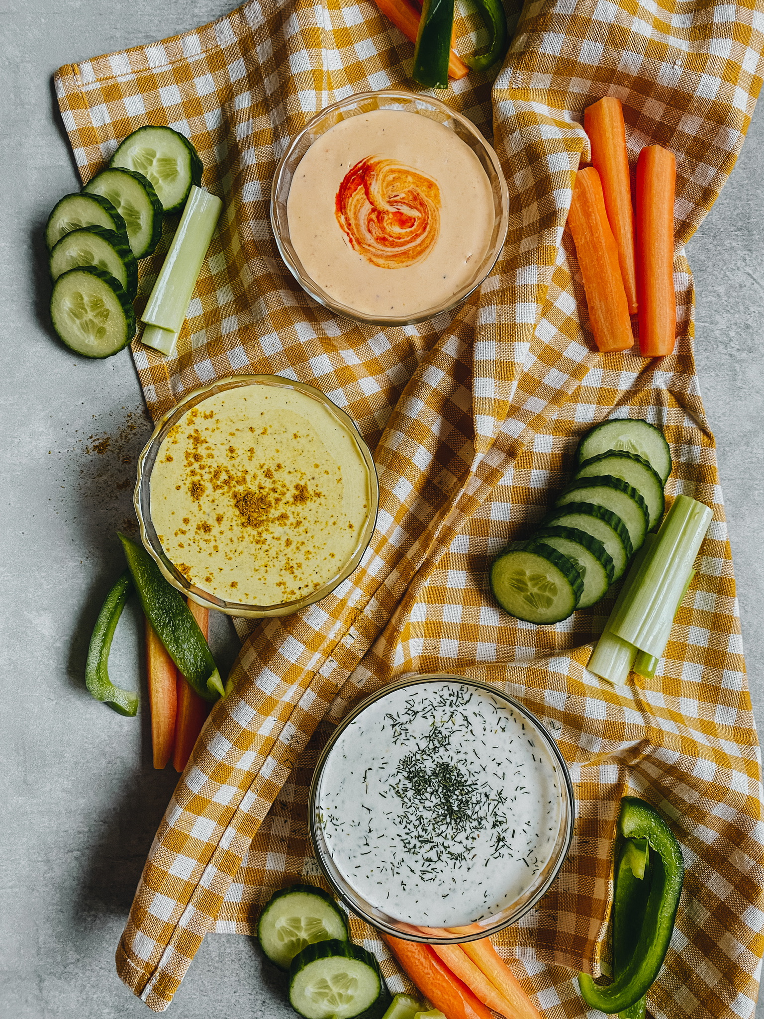 J’adore manger des crudités avec de la trempette. Malheureusement, la culture des diètes a trop souvent diabolisé celle-ci. Honnêtement, ça m’arrive de manger des crudités juste comme ça, mais ça m’arrive aussi souvent de vouloir en manger trempées dans une savoureuse trempette et c’est très très correct aussi ! Avec l’arrivée du printemps, il me semble que c’est le temps de sortir les petites collations rafraîchissantes !