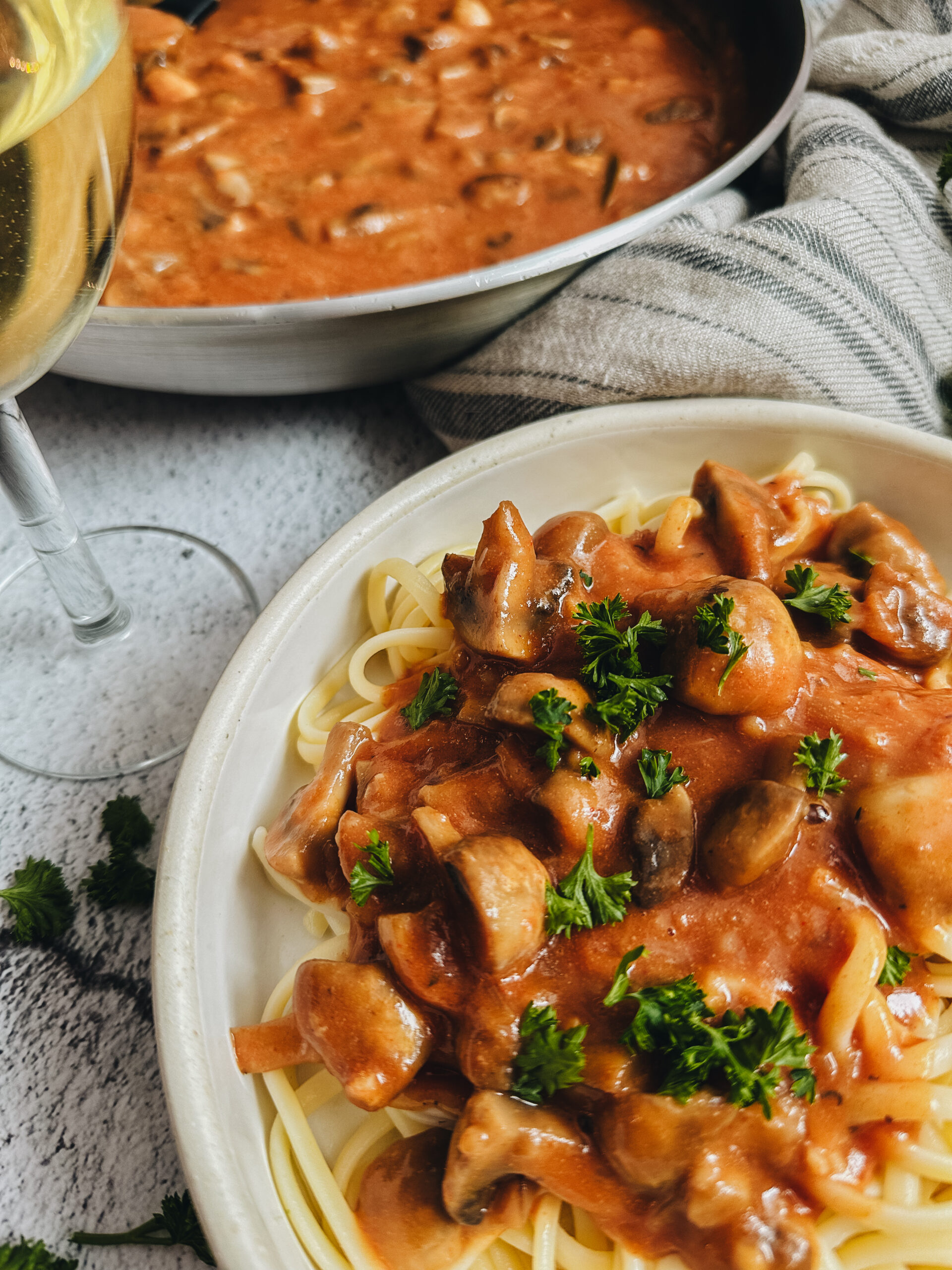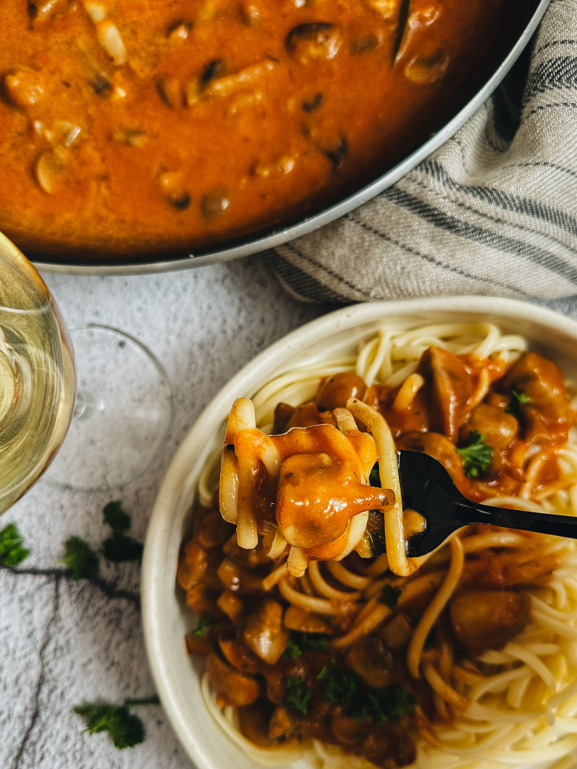 Quand j’étais petite, le père de mon amie d’enfance cuisinait souvent du bœuf Stroganoff et je trouvais ça tellement bon ! C’est une des premières recettes que j’ai cuisinée quand j’avais environ quinze ans. C’est assez difficile de véganiser cette recette parce que le bœuf est difficilement remplaçable. Par contre, le bœuf est souvent accompagné de champignons et honnêtement, simplement l’omettre en ajoutant un extra champignons, c’est tout aussi savoureux !