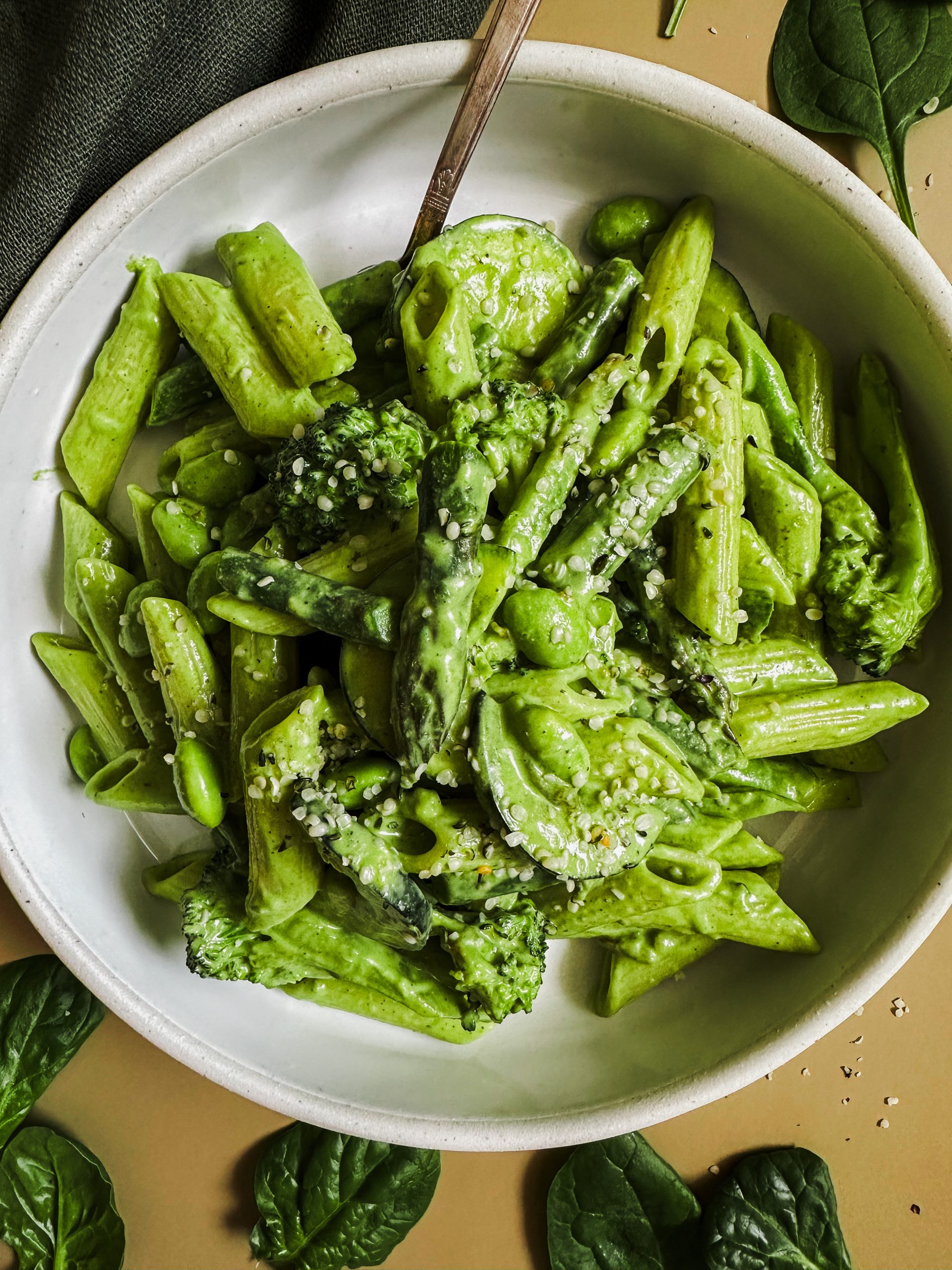 Une nouvelle recette absolument parfaite pour le printemps. À la base, je voulais créer une recette de pâtes primavera. Je voulais mettre de l’avant nos délicieux légumes de saison (allô les asperges en rabais à l’épicerie), puis en cuisinant je me suis rendue compte à quel point tout était vert et ça me faisait pensant au « trend » des plats « Green Goddess ». Alors nous y voilà avec cette savoureuse recette ultra crémeuse et remplie de bons aliments verts !
